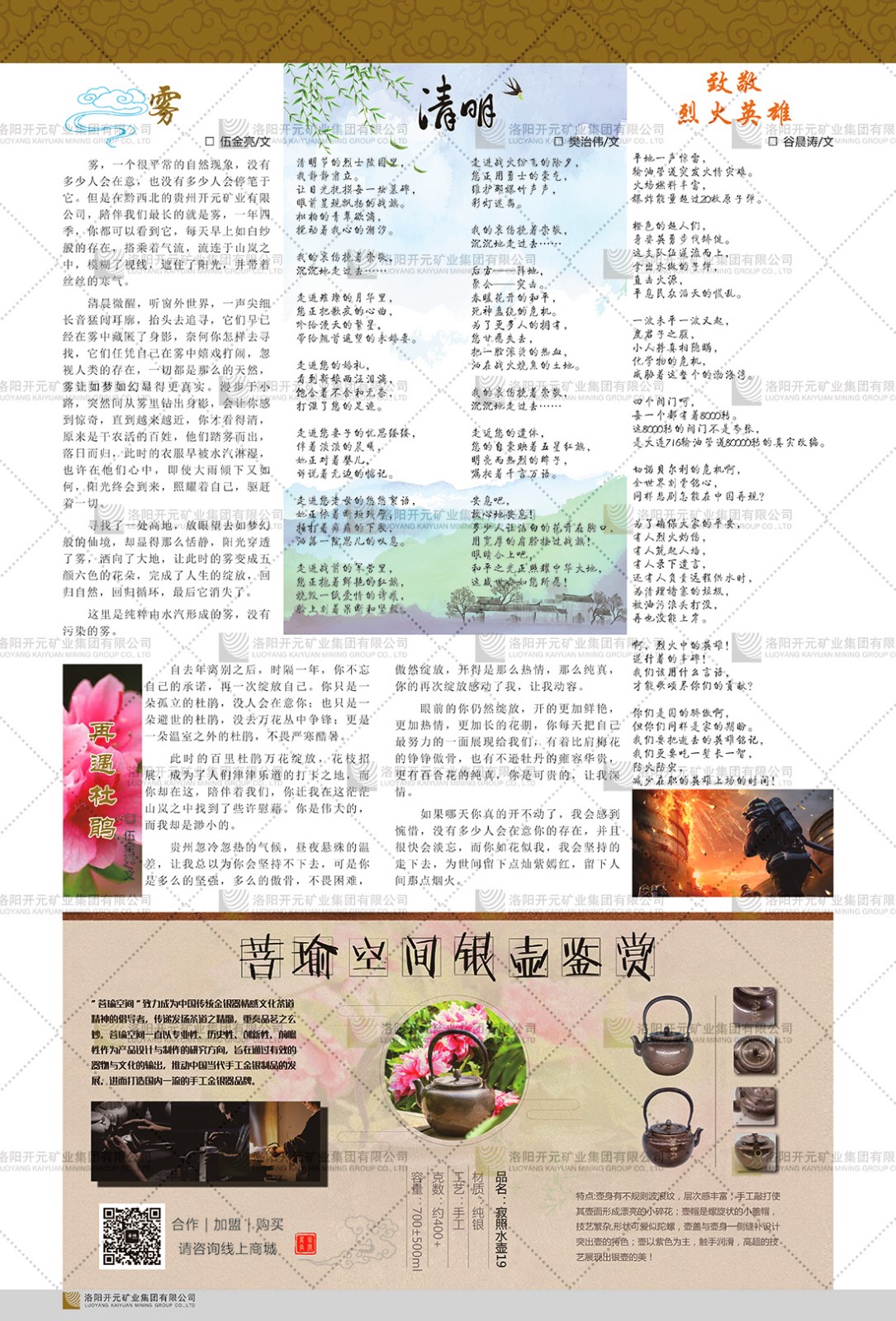 洛陽(yáng)開(kāi)元礦業(yè)集團(tuán)有限公司簡(jiǎn)介洛陽(yáng)開(kāi)元礦業(yè)集團(tuán)有限公司,始成立于2006年,位于洛陽(yáng)市開(kāi)元大道269號(hào)。集團(tuán)旗下共有五余家全資子公司,業(yè)務(wù)涉及有色金屬礦山開(kāi)發(fā)、礦產(chǎn)品購(gòu)銷(xiāo)與進(jìn)出口貿(mào)易、房地產(chǎn)開(kāi)發(fā)、文化藝術(shù)、企業(yè)管理與咨詢(xún)、資本投資等多個(gè)領(lǐng)域。民建河南省委委員、民建河南省委企業(yè)委副主任、民建洛陽(yáng)市委委員、企業(yè)委主任、洛陽(yáng)民建企業(yè)家協(xié)會(huì)會(huì)長(zhǎng)許明月是公司創(chuàng)始人,現(xiàn)任洛陽(yáng)開(kāi)元礦業(yè)集團(tuán)有限公司董事長(zhǎng)。在礦業(yè)領(lǐng)域,洛陽(yáng)開(kāi)元礦業(yè)集團(tuán)擁有多家實(shí)力雄厚的子公司:貴州開(kāi)元礦業(yè)有限公司探、采礦權(quán)面積共11.33平方公里;興海縣銅鑫礦業(yè)有限公司探礦權(quán)面積8.76平方公里,礦山資源潛力巨大;2021年,開(kāi)元集團(tuán)與盧氏中科礦業(yè)有限公司開(kāi)展戰(zhàn)略合作。盧氏中科礦業(yè)有限公司專(zhuān)注于有色金屬的浮選、加工和銷(xiāo)售,擁有強(qiáng)大的技術(shù)支撐平臺(tái),是集探、采、選、冶、研為一體的中大型綜合礦業(yè)企業(yè)。目前,盧氏中科王家河1000噸選礦廠已成功投產(chǎn),雙河金礦、柳關(guān)欒盧鉛鋅礦相繼順利開(kāi)工,樓房銀礦與圪老灣鉛鋅礦的深部探礦重大突破,標(biāo)志著礦山版圖取得重大進(jìn)展,為開(kāi)元集團(tuán)后續(xù)發(fā)展奠定了堅(jiān)實(shí)基礎(chǔ)。在文化傳媒領(lǐng)域,洛陽(yáng)市明月美術(shù)館通過(guò)豐富多樣的藝術(shù)展覽、學(xué)術(shù)研討和公共教育活動(dòng),努力打造一個(gè)集展覽、交流、教育、研究為一體的綜合性藝術(shù)平臺(tái)。此外,在金融投資領(lǐng)域,開(kāi)元集團(tuán)旗下的北京明峰資本管理有限公司專(zhuān)注于投資具有高增長(zhǎng)潛力的優(yōu)秀企業(yè),特別是高科技、新能源、環(huán)保等新興產(chǎn)業(yè),為客戶(hù)提供個(gè)性化的資產(chǎn)配置服務(wù)。在做好企業(yè)經(jīng)營(yíng)的同時(shí),開(kāi)元集團(tuán)始終不忘企業(yè)的社會(huì)責(zé)任和家國(guó)情懷,以突出的愛(ài)心公益事跡,開(kāi)展了一系列公益慈善活動(dòng):“民建林”公益事業(yè)通過(guò)“思源基金”“幫幫公益”線上公益平臺(tái),與眾多愛(ài)心人士籌措資金20余萬(wàn)元;資助541名貧困大學(xué)生共計(jì)270余萬(wàn)元,推進(jìn)“數(shù)字助力——河南AI人才培養(yǎng)”;捐款10萬(wàn)元,馳援京津冀、黑龍江洪水地質(zhì)災(zāi)害……公司于2017年底被洛陽(yáng)市慈善總會(huì)評(píng)為“洛陽(yáng)慈善風(fēng)云榜——十大愛(ài)心集體”。洛陽(yáng)開(kāi)元礦業(yè)集團(tuán)有限公司秉承持續(xù)發(fā)展理念,憑借多年來(lái)良好的企業(yè)信譽(yù)與經(jīng)營(yíng)業(yè)績(jī),與全國(guó)多家企業(yè)建立了良好合作關(guān)系,受到社會(huì)各界的一致好評(píng),多次榮獲“納稅標(biāo)兵”“先進(jìn)企業(yè)”“招商引資模范企業(yè)”等榮譽(yù)稱(chēng)號(hào)。回望來(lái)時(shí)路,開(kāi)元人勠力同心,以“闖”的精神和“創(chuàng)”的勁頭,一路披荊斬棘,踏過(guò)千山萬(wàn)水;展望新未來(lái),開(kāi)元人凝心聚力,不執(zhí)于“舊”,無(wú)畏于“新”,秉承“勇于跨越,追求卓越”的企業(yè)精神,乘著國(guó)家高質(zhì)量發(fā)展新征程的東風(fēng),跨過(guò)高山,越過(guò)大海,向著集團(tuán)多元化、國(guó)際化的目標(biāo),逐夢(mèng)遠(yuǎn)航,跨越前行!