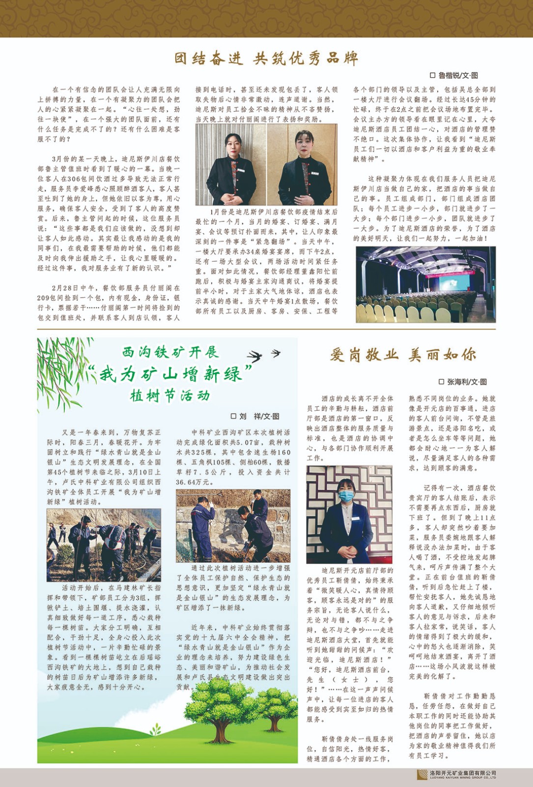洛陽開元礦業(yè)集團有限公司簡介洛陽開元礦業(yè)集團有限公司,始成立于2006年,位于洛陽市開元大道269號。集團旗下共有五余家全資子公司,業(yè)務涉及有色金屬礦山開發(fā)、礦產品購銷與進出口貿易、房地產開發(fā)、文化藝術、企業(yè)管理與咨詢、資本投資等多個領域。民建河南省委委員、民建河南省委企業(yè)委副主任、民建洛陽市委委員、企業(yè)委主任、洛陽民建企業(yè)家協(xié)會會長許明月是公司創(chuàng)始人,現(xiàn)任洛陽開元礦業(yè)集團有限公司董事長。在礦業(yè)領域,洛陽開元礦業(yè)集團擁有多家實力雄厚的子公司:貴州開元礦業(yè)有限公司探、采礦權面積共11.33平方公里;興??h銅鑫礦業(yè)有限公司探礦權面積8.76平方公里,礦山資源潛力巨大;2021年,開元集團與盧氏中科礦業(yè)有限公司開展戰(zhàn)略合作。盧氏中科礦業(yè)有限公司專注于有色金屬的浮選、加工和銷售,擁有強大的技術支撐平臺,是集探、采、選、冶、研為一體的中大型綜合礦業(yè)企業(yè)。目前,盧氏中科王家河1000噸選礦廠已成功投產,雙河金礦、柳關欒盧鉛鋅礦相繼順利開工,樓房銀礦與圪老灣鉛鋅礦的深部探礦重大突破,標志著礦山版圖取得重大進展,為開元集團后續(xù)發(fā)展奠定了堅實基礎。在文化傳媒領域,洛陽市明月美術館通過豐富多樣的藝術展覽、學術研討和公共教育活動,努力打造一個集展覽、交流、教育、研究為一體的綜合性藝術平臺。此外,在金融投資領域,開元集團旗下的北京明峰資本管理有限公司專注于投資具有高增長潛力的優(yōu)秀企業(yè),特別是高科技、新能源、環(huán)保等新興產業(yè),為客戶提供個性化的資產配置服務。在做好企業(yè)經(jīng)營的同時,開元集團始終不忘企業(yè)的社會責任和家國情懷,以突出的愛心公益事跡,開展了一系列公益慈善活動:“民建林”公益事業(yè)通過“思源基金”“幫幫公益”線上公益平臺,與眾多愛心人士籌措資金20余萬元;資助541名貧困大學生共計270余萬元,推進“數(shù)字助力——河南AI人才培養(yǎng)”;捐款10萬元,馳援京津冀、黑龍江洪水地質災害……公司于2017年底被洛陽市慈善總會評為“洛陽慈善風云榜——十大愛心集體”。洛陽開元礦業(yè)集團有限公司秉承持續(xù)發(fā)展理念,憑借多年來良好的企業(yè)信譽與經(jīng)營業(yè)績,與全國多家企業(yè)建立了良好合作關系,受到社會各界的一致好評,多次榮獲“納稅標兵”“先進企業(yè)”“招商引資模范企業(yè)”等榮譽稱號。回望來時路,開元人勠力同心,以“闖”的精神和“創(chuàng)”的勁頭,一路披荊斬棘,踏過千山萬水;展望新未來,開元人凝心聚力,不執(zhí)于“舊”,無畏于“新”,秉承“勇于跨越,追求卓越”的企業(yè)精神,乘著國家高質量發(fā)展新征程的東風,跨過高山,越過大海,向著集團多元化、國際化的目標,逐夢遠航,跨越前行!